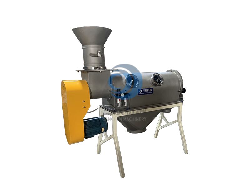 篩機(jī)由電機(jī)、機(jī)座、篩箱、進(jìn)出料推進(jìn)裝置等組成。物料由料斗經(jīng)螺旋輸送進(jìn)入篩箱,分流葉片連續(xù)轉(zhuǎn)動(dòng),形成了物料在篩箱內(nèi)不斷的更新推進(jìn),使物料產(chǎn)生運(yùn)動(dòng)沖向篩網(wǎng),細(xì)料通過(guò)篩網(wǎng)落入成品倉(cāng),粗料繼續(xù)向前推進(jìn),在粗料口排出,從而達(dá)到理想的篩分效果。